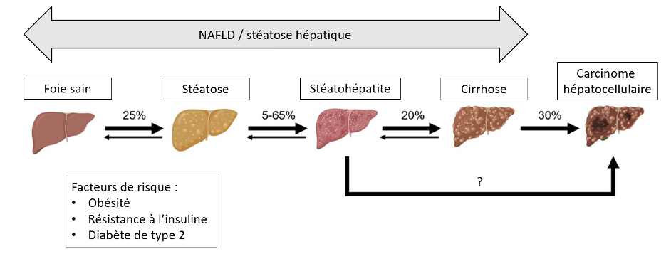- Cette dernière peut progresser vers une fibrose hépatique et des complications plus sévères, comme la cirrhose hépatique ou le carcinome hépatocellulaire (CHC)