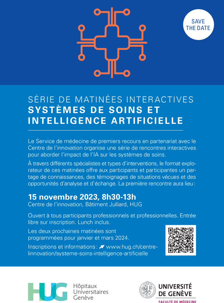 Le Service de médecine de premier recours, le Centre de l'innovation et la Direction de la communication avec nombreux interlocuteurs des HUG, de l'Université de Genève et partenaires impliqués dans l’IA, initient cette réflexion pour créer une arène de discussion autour des premières expériences et expertises IA dans les systèmes de soins.