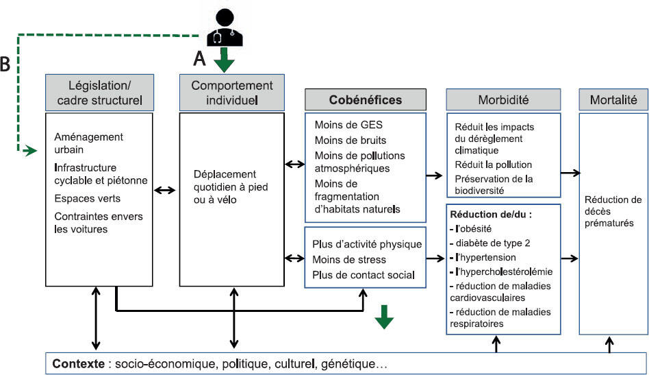 Dans un même temps, les impacts sur la santé de la mobilité motorisée sont multiples, notamment du fait de la pollution de l’air 5 (par exemple, NO2, PM2,5, PM10, O3), du bruit (associé au développement de maladies cardiovasculaires et des impacts délétères sur le sommeil, le stress et le développement cognitif des enfants 6 , 7 , avec environ 14 % de la population suisse exposée à un bruit routier excessif 10 , 8 ) ou en contribuant à la sédentarité de la population (associée à un éventail de maladies non transmissibles qui incluent diabète de type II, maladies cardiovasculaires et respiratoires et plusieurs cancers 10 ). L’OMS recommande en effet pour les adultes un minimum de 150 minutes d’activité physique modérée hebdomadaire 11 mais un nombre croissant de personnes n’atteignent pas cet objectif. En Suisse, l’OFS estime en 2012 que 28 % de la population est insuffisamment active ou totalement inactive et le manque de temps est couramment mis en avant pour expliquer la difficulté à s’engager dans une activité physique régulière 4 , 12 - 13 . À noter aussi que la congestion des axes routiers, l’occupation de l’espace public par des voies de circulation et les places de stationnement, les effets de coupures liées à ces infrastructures ainsi que les îlots de chaleur qu’elles renforcent dégradent les cadres de vie, réduisent les espaces verts et de rencontre et fragilisent ainsi le capital social 5 .
