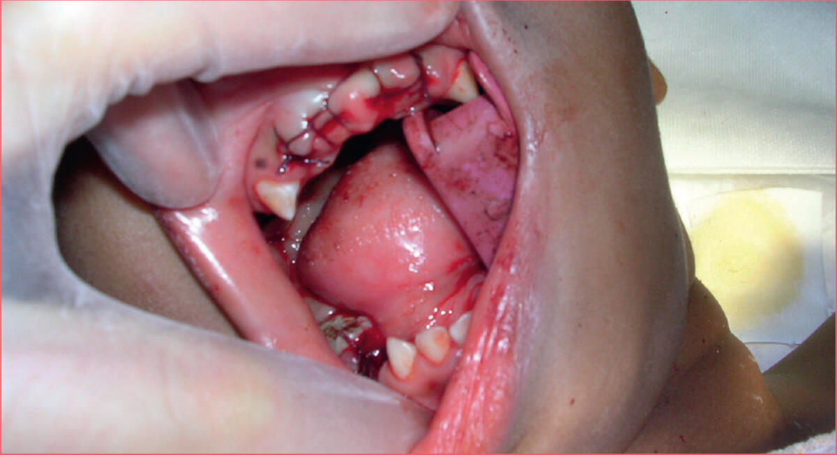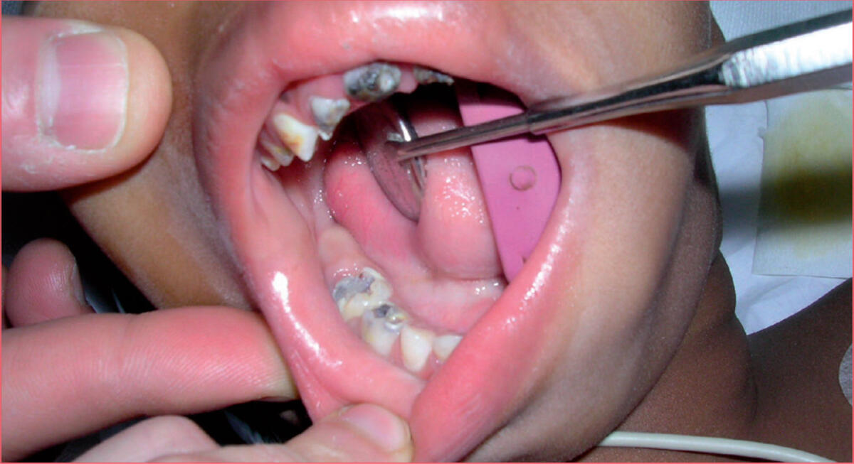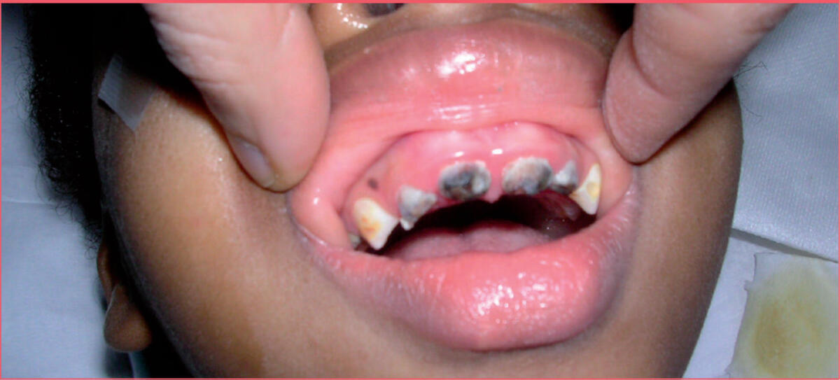 À l’examen clinique, l’enfant est alerte mais craintive et fuit la palpation de la joue. Le statut général est sans particularité. Par contre, l’examen buccal est caractéristique (figure 1) : les incisives de lait sont brunes avec une perte de substance du bord libre noirâtre qui suit la trace de la tétine ; les dents voisines présentent une atteinte moindre mais sévère. On met en évidence une atteinte carieuse concernant la plupart des dents présentes (figure 2). Le diagnostic de carie du biberon (CDB) est retenu avec complication par abcès dentaire et irradiation douloureuse vers l’oreille. La jeune patiente devra subir, sous narcose, onze extractions et des soins sur quatre dents (figure 3).