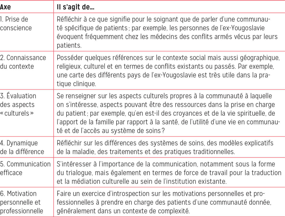 Une approche biopsychosociale et spirituelle initiale, complétée par une lecture systémique des événements en trois temps selon le modèle de Massé, permet de mieux appréhender des situations médicales parfois inconnues et inquiétantes, souvent surpre-nantes. Ces deux approches complémentaires sont intégrées dans l’enseignement des compétences transculturelles que nous généralisons progressivement à Lausanne dans le cadre prégradué, postgradué et de formation continue. Les compétences transculturelles peuvent se définir comme étant « la capacité des soignants, des institutions et de l’ensemble du personnel à offrir des services adaptés à une population de race, d’ethnie ou de culture différentes 17 », plus simplement, il pourrait s’agir de « la capacité à travailler plus spécifiquement avec des patients d’origines diverses 18 ». Cet enseignement a pour objectif de sensibiliser à la différence culturelle de nos patients, mais en aucun cas d’être un enseignement exhaustif systématique par culture d’origine ; il est attentif aux risques de généralisation, voire de stigmatisation 19. Il exige de s’ouvrir à l’autre en tenant compte de nos propres référentiels en termes de culture d’origine mais aussi de culture professionnelle 20. Il peut s’articuler autour de six thématiques différentes 17,21,22 (tableau I).