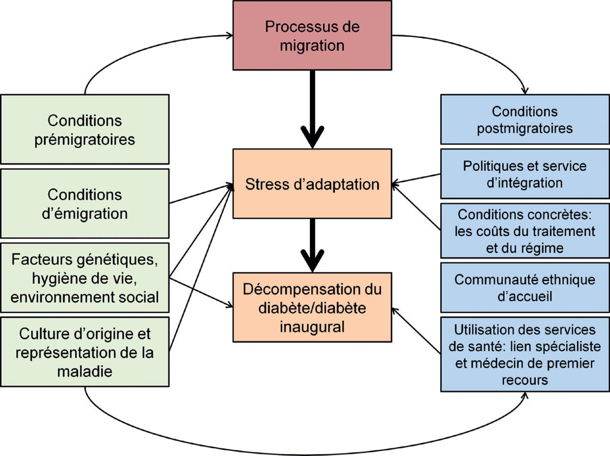 le vécu d’une maladie chronique telle que le diabète, maladie initialement asympto-matique, intègre les conditions prémigratoires (facteurs génétiques, hygiène de vie), les conditions de migration ainsi que les conditions postmigratoires : selon le rôle du migrant dans la communauté, des difficultés se greffent sur la gestion des différents temps de la vie quotidienne, empêchant une prise en charge adéquate de cette maladie ;