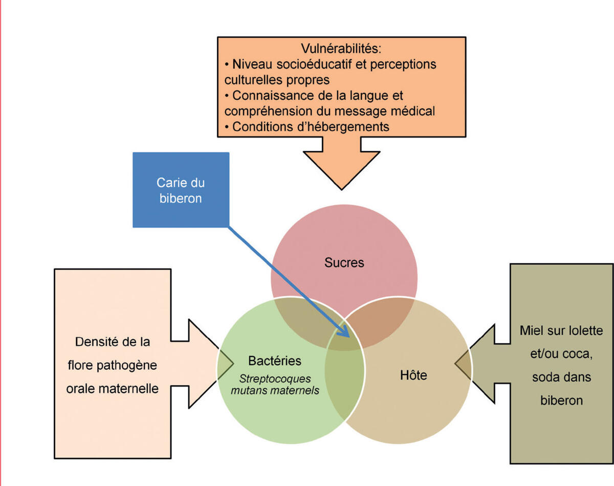 La carie du biberon (CDB) se développe sur la dentition primaire peu de temps après l’éruption des dents ; elle est initiée et entretenue par la consommation de boissons sucrées au biberon au coucher ou pendant les siestes de l’enfant. Le fait que la dentition lactéale, principalement les quatre incisives supérieures, baigne par écoulement du biberon dans un environnement fortement sucré au cours du sommeil ou de l’endormissement est à l’origine de ce type unique de caries 2. La prévalence de la CDB est difficile à évaluer car très variable 3, l’influence des facteurs culturels et d’habitat (ville/campagne) sur les habitudes alimentaires complique les études comparatives entre populations. Un lien entre certaines minorités ethniques et la forte prévalence de la CDB existe. Le fait que la famille soit monoparentale, qu’elle ne parle pas la langue du pays d’accueil et que l’âge maternel soit inférieur à 26 ans aggrave le risque de CDB 4. Pour les enfants migrants des banlieues de Stockholm, il a été établi chez 832 enfants, de deux ans et demi d’âge moyen, que les principaux facteurs de risque de la CDB sont une colonisation par Streptococcus mutans (figure 4) et le fait d’appartenir à une famille de migrants. Dans le même pays, Wendt a démontré que les enfants de migrants reçoivent significativement plus de repas nocturnes et de boissons sucrées en biberon que les autochtones et qu’ils ont plus de caries précoces 5. Ces séquelles insidieuses de la migration n’ont pas une cause unique : la CDB est également retrouvée chez des enfants migrants non alimentés au biberon 6. La CDB apparaît ainsi au carrefour de plusieurs comportements alimentaires surprotecteurs parmi lesquels l’usage diurne et nocturne du biberon est une circonstance aggravante mais non suffisante pour expliquer la pathologie 2,4 (figure 4). Parmi les pistes étiopatho-géniques complémentaires, il faut envisager les différences dans la perception de la den-ture, et tout particulièrement des dents lactéales dans la santé générale par des groupes ethniques culturellement différents : la dentition temporaire est vécue comme une étape presque facultative, sans importance, qui ne devrait pas requérir des soins majeurs ou même motiver le brossage 6. Les pressions du milieu d’accueil s’exercent aussi : la promiscuité des hébergements conduit à faire taire l’enfant au plus vite quand elle pleure la nuit ; de plus et paradoxalement, l’immigration s’accompagne d’une aggravation du risque de carie : l’augmentation relative du niveau de vie dans le pays hôte (dont l’accès à une alimentation plus riche en hydrates de carbone) se traduit par un nombre plus élevé de caries chez ceux qui sont arrivés depuis cinq ans par rapport aux nouveaux arrivants 6. Dans notre pratique, la présence de CDB dans la population autochtone suisse est réellemais exceptionnelle ; les patients traités pour cette affection sont des enfants de la première ou de la deuxième génération de la migration, vivant généralement dans des conditions socio-économiques défavorisées. Le coût en termes de santé publique est élevé : 2 300 à 2 800 CHF par patient traité. Le coût en termes de santé des enfants est bien plus lourd : le développement bucco-facial d’enfants édentés largement et précocement est altéré ; l’intégration sociale et l’acquisition du langage sont perturbées avec des conséquences à long terme jamais évaluées à notre connaissance.