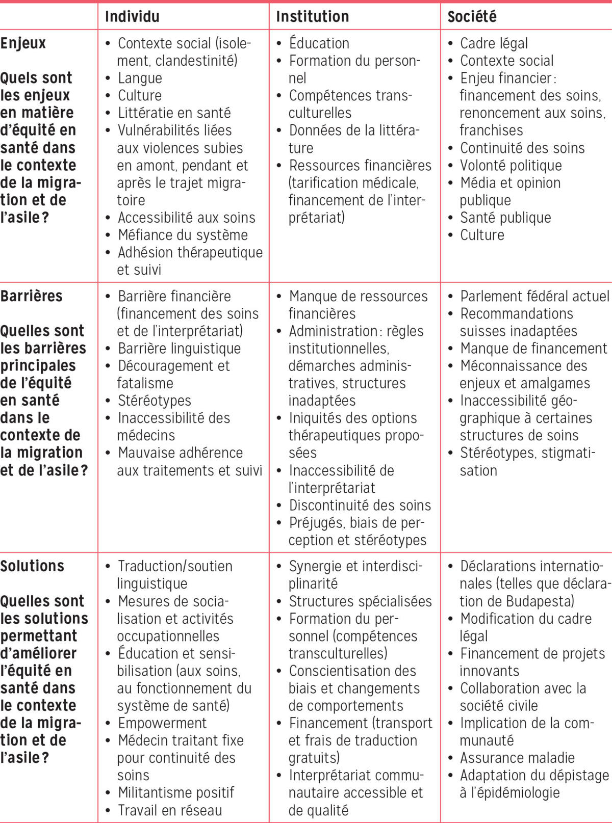 La deuxième partie du Symposium a servi à synthétiser le contenu de ces ateliers afin de ressortir la quintessence des propos recueillis tout au long des discussions. Le principal constat est le suivant : malgré des thématiques variées, de nombreux points communs ont émergé des ateliers, mettant ainsi en lumière les enjeux, solutions et barrières de l’équité en santé chez les personnes issues d’asile dont la langue, le statut socio-économique, l’isolement social, le cadre légal et administratif, la formation du personnel (en particulier des compétences cliniques transculturelles), le financement et la continuité des soins. À ces similitudes s’ajoutent de nombreux enjeux, solutions et barrières spécifiques à une sous-population (le sexisme et les violences sexuelles dont sont victimes les femmes par exemple), une situation sociale (stigmatisation et méconnaissance des personnes incar-cérées) ou un problème de santé (enjeux culturels et linguistiques dans le contexte des maladies psychiques). Le détail complet de cette synthèse est présenté sous forme de tableau (cf. tableau I).