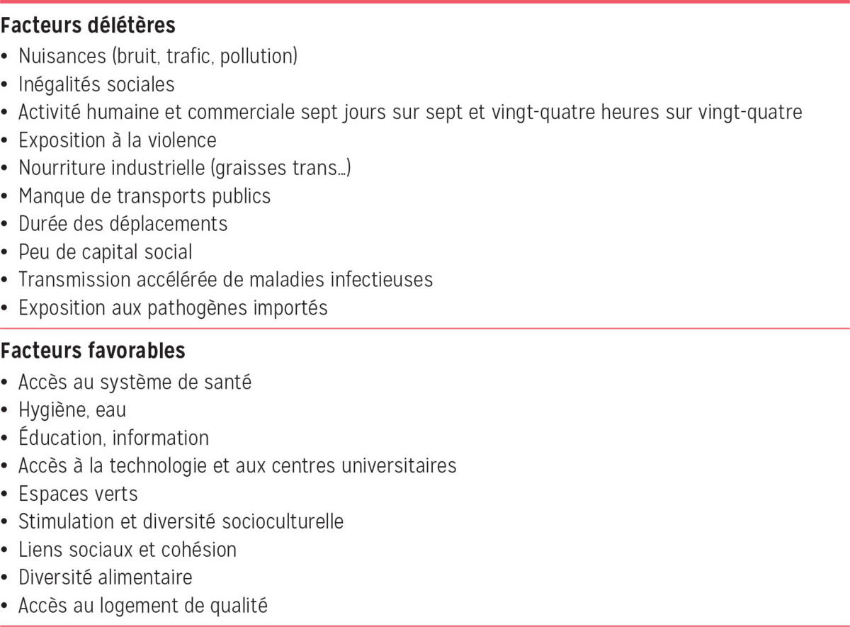 La croissance démographique est spectaculaire dans les pays en voie de développement. Alors que Londres est passée de 1 à 8 millions d’habitants en cent trente ans, il n’a fallu, pour le faire, que quarante-cinq, trente-sept et vingt-cinq ans à Bangkok, Dhaka et Séoul, respectivement 1. Cette évolution rapide entraîne une modification de l’équilibre social et urbanistique des villes, avec l’apparition fréquente de bidonvilles et des inégalités sociales. En 2014, ONU-Habitat, le programme des Nations unies œuvrant pour un meilleur avenir urbain, estimait qu’environ 880 millions de gens vivaient dans des bidonvilles 4 (29,7% de la population urbaine totale). Il est aujourd’hui évident que les facteurs influençant la santé dans les villes déterminent l’état de santé des populations sur le plan global, autant pour les facteurs délétères que pour les facteurs protecteurs (tableau I).