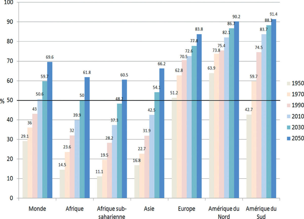 Après une forte croissance de la population mondiale, qui a vu son point culminant en 1969 où la croissance annuelle était de 2,1%, nous observons une baisse significative à 1,05%/an en 2020 ce qui équivaut tout de même à une augmentation de 81 millions chaque année pour un total de 7,9 milliards d’êtres humains en 2021 1. Ce ralentissement de l’accroissement de la population mondiale ne se traduit pas d’un ralentissement de l’urbanisation, tout au contraire, elle continue à s’accélérer. L’urbanisation rapide peut être génératrice de pauvreté et d’inégalités sociales. L’enjeu du futur sera de maîtriser, sur le plan global, ces deux facteurs et de permettre une évolution démographique harmonieuse.