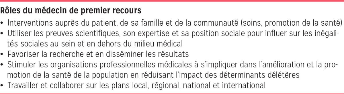 • Les médecins de premier recours sont idéalement placés pour saisir les réalités sociales et sanitaires, et peuvent utiliser leur position sociale pour influer sur les inégalités sociales.