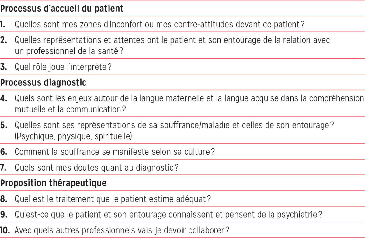 Il est essentiel de reconnaître ce qui peut entraver la communication entre un patient et un médecin d’origines culturelles différentes. Notre approche clinique en 10 questions, complémentaire au guide de Kleinman, stimule un questionnement sur le rôle de la culture chez tout individu et peut ainsi faciliter la construction de l’alliance thérapeutique entre le patient et le médecin de cultures différentes, limiter les erreurs diagnostiques et faciliter l’accès aux soins psychiatriques pour cette population.