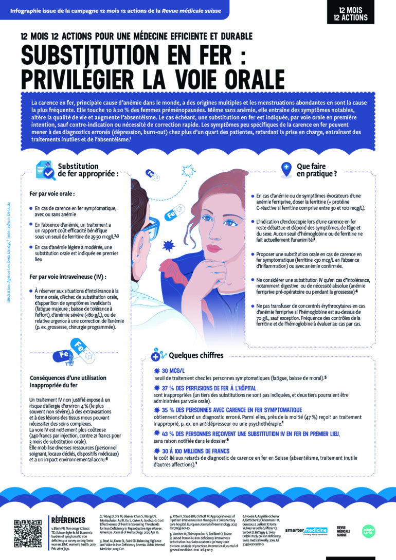La carence en fer, principale cause d’anémie dans le monde, a des origines multiples et les menstruations abondantes en sont la cause la plus fréquente. Elle touche 10 à 20 % des femmes préménopausées. Même sans anémie, elle entraîne des symptômes notables, altère la qualité de vie et augmente l’absentéisme. Le cas échéant, une substitution en fer est indiquée, par voie orale en première intention, sauf contre-indication ou nécessité de correction rapide. Les symptômes peu spécifiques de la carence en fer peuvent mener à des diagnostics erronés (dépression, burn-out) chez plus d’un quart des patientes, retardant la prise en charge, entraînant des traitements inutiles et de l’absentéisme.