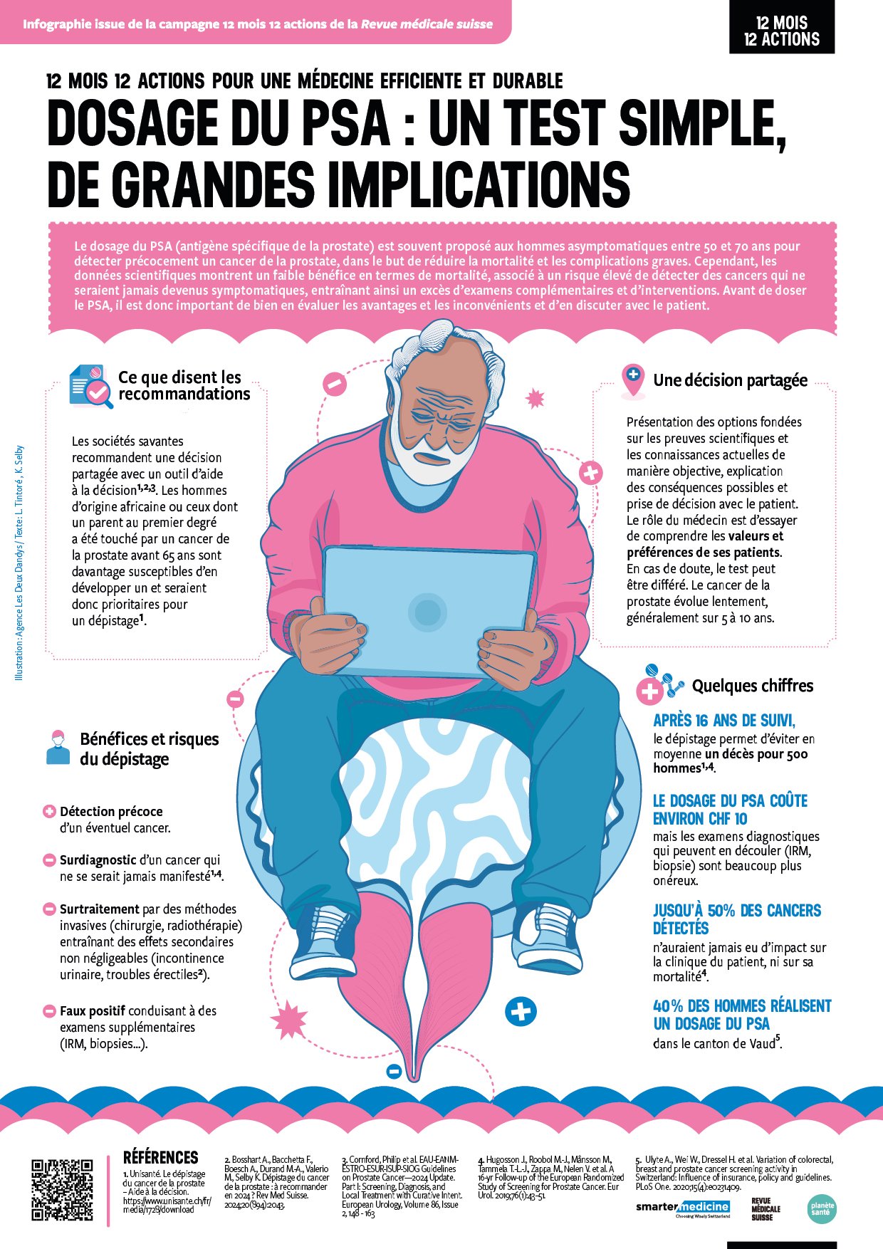 Le dosage du PSA (antigène spécifique de la prostate) est souvent proposé aux hommes asymptomatiques entre 50 et 70 ans pour détecter précocement un cancer de la prostate, dans le but de réduire la mortalité et les complications graves. Cependant, les données scientifiques montrent un faible bénéfice en termes de mortalité, associé à un risque élevé de détecter des cancers qui ne seraient jamais devenus symptomatiques, entraînant ainsi un excès d’examens complémentaires et d’interventions. Avant de doser le PSA, il est donc important de bien en évaluer les avantages et les inconvénients et d’en discuter avec le patient.