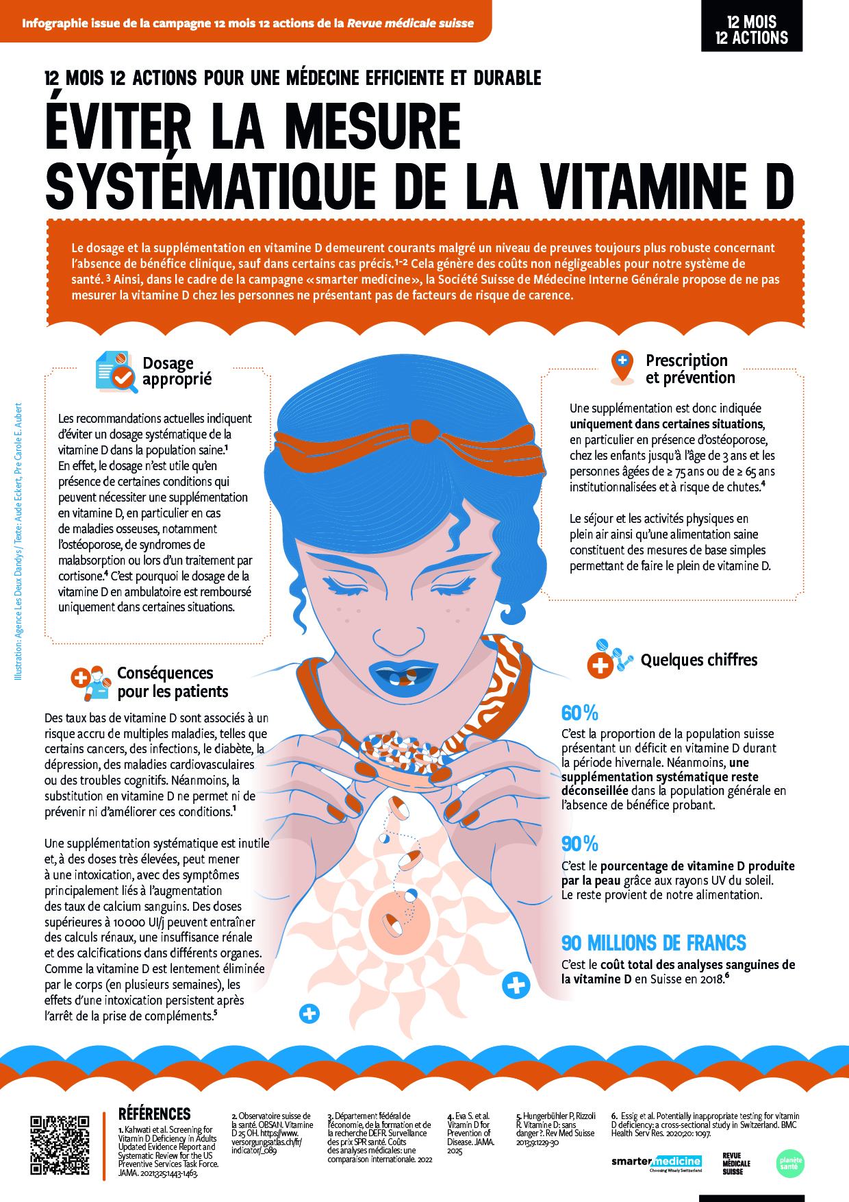 Le dosage et la supplémentation en vitamine D demeurent courants malgré un niveau de preuves toujours plus robuste concernant l'absence de bénéfice clinique, sauf dans certains cas précis.1-2 Cela génère des coûts non négligeables pour notre système de santé. 3 Ainsi, dans le cadre de la campagne « smarter medicine », la Société Suisse de Médecine Interne Générale propose de ne pas mesurer la vitamine D chez les personnes ne présentant pas de facteurs de risque de carence.