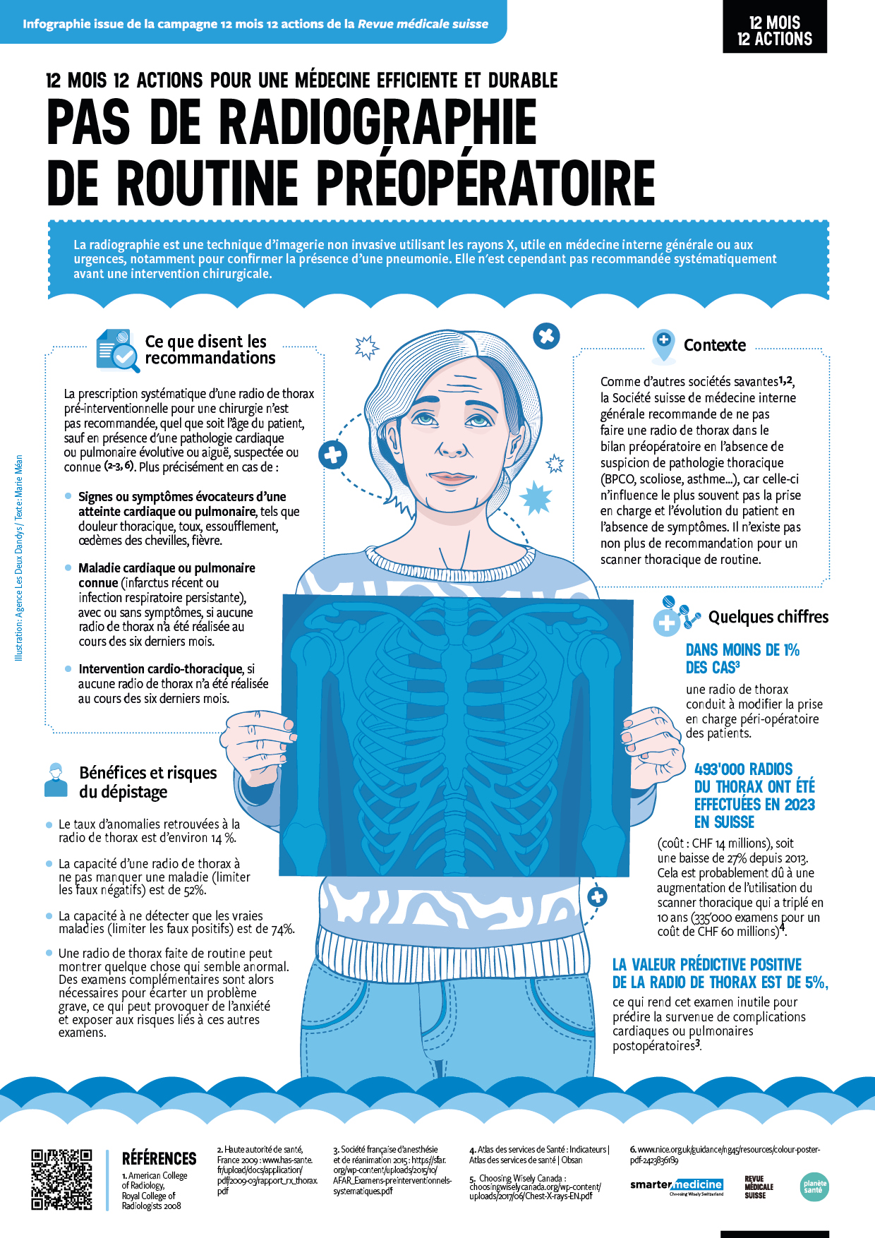 La radiographie est une technique d’imagerie non invasive utilisant les rayons X, utile en médecine interne générale ou aux urgences, notamment pour confirmer la présence d’une pneumonie. Elle n'est cependant pas recommandée systématiquement avant une intervention chirurgicale.
