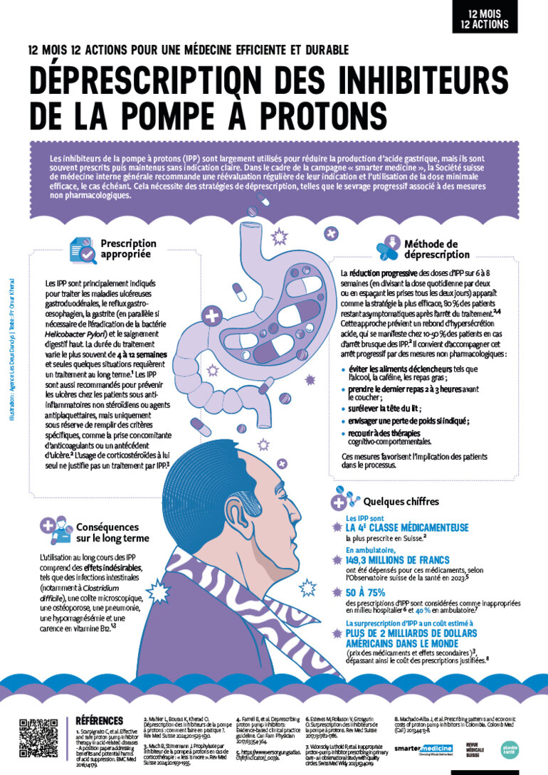 Les inhibiteurs de la pompe à protons (IPP) sont largement utilisés pour réduire la production d’acide gastrique, mais ils sont souvent prescrits puis maintenus sans indication claire. Dans le cadre de la campagne « smarter medicine », la Société suisse de médecine interne générale recommande une réévaluation régulière de leur indication et l’utilisation de la dose minimale efficace, le cas échéant. Cela nécessite des stratégies de déprescription, telles que le sevrage progressif associé à des mesures non pharmacologiques.