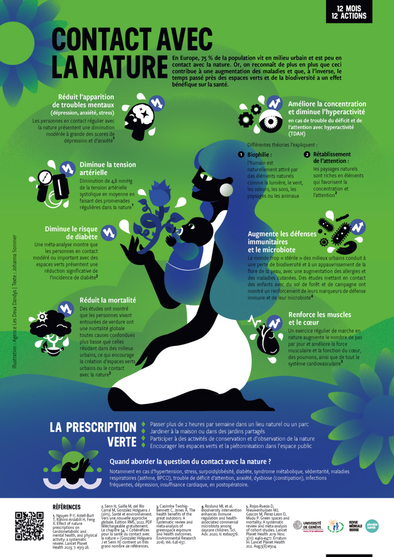 En Europe, 75% de la population vit en milieu urbain et est peu en contact avec la nature. Or, on reconnaît de plus en plus que ceci contribue à une augmentation des maladies et que, à l'inverse, le temps passé près des espaces verts et de la biodiversité a un effet bénéfique sur la santé.
