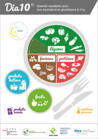 Dia 10 est un système d’équivalences qui propose des portions d’aliments contenant toutes 10 g de glucides, la plupart sont illustrées par une photo. Cette brochure est destinée aux personnes diabétiques qui doivent calculer la teneur glucidique de leurs repas. Chaque portion étant équivalente, l’utilisateur pourra aisément évaluer l’apport glucidique de ses repas, tout en variant son alimentation, grâce au choix d’une centaine d’aliments. Pour les autres aliments, une aide est proposée pour calculer la teneur en glucides, par la lecture de l’étiquetage nutritionnel. Des explications par un professionnel spécialisé dans le domaine de la diabétologie sont recommandées pour guider l’utilisateur et définir ses besoins spécifiques.