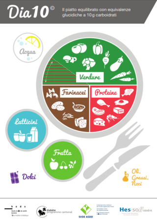 Dia10 è un sistema di equivalenze, nel quale ogni porzione apporta 10 g di carboidrati. Questo documento è pensato per i pazienti diabetici, per facilitare il calcolo dell’apporto di carboidarati al pasto. I pesi indicati non sono consigli riguardo alle porzioni raccomandate al pasto; le quantità vanno adattate ai bisogni di ognuno. Per i cibi che non si trovano indicati in questo opuscolo, la quantità di carboidrati può essere calcolata con l’aiuto della tabella a pag. 15, usando i valori nutrizionali che sono indicati sugli imballaggi dei cibi. Le bevande zuccherate non figurano in Dia10, poiché non sono raccomandate, al di fuori della necessità di compensare delle ipoglicemie. Le spiegazioni di un professionista specializzato nell’ambito della diabetologia sono necessarie.